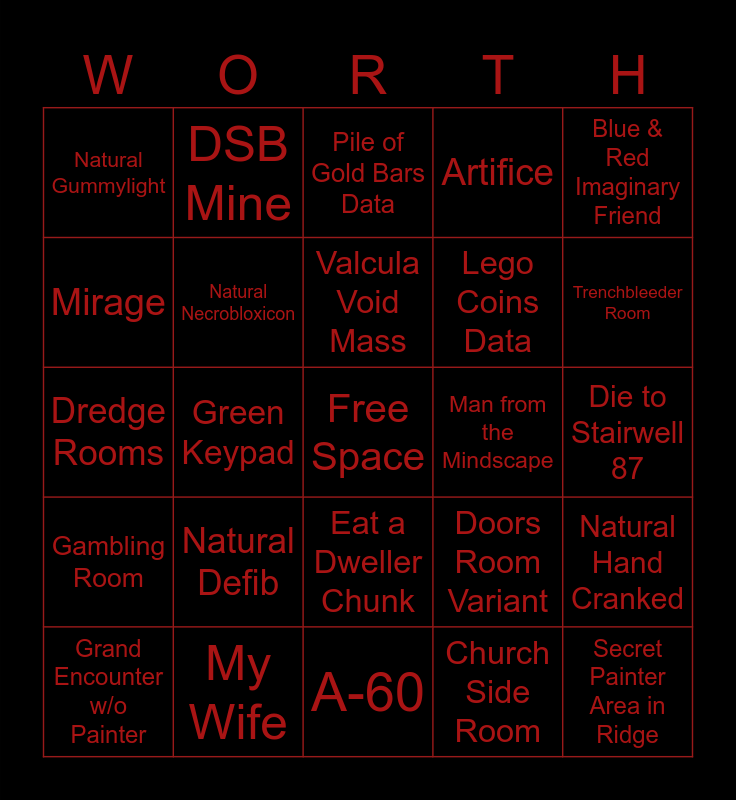 This bingo card has a free space and 24 words: Natural Defib, My Wife, Valcula Void Mass, Grand Encounter w/o Painter, Blue & Red Imaginary Friend, Natural Gummylight, Mirage, DSB Mine, Man from the Mindscape, Eat a Dweller Chunk, Lego Coins Data, Dredge Rooms, Doors Room Variant, Natural Hand Cranked, Natural Necrobloxicon, Church Side Room, Die to Stairwell 87, Pile of Gold Bars Data, Trenchbleeder Room, Green Keypad, Secret Painter Area in Ridge, Gambling Room, Artifice and A-60.