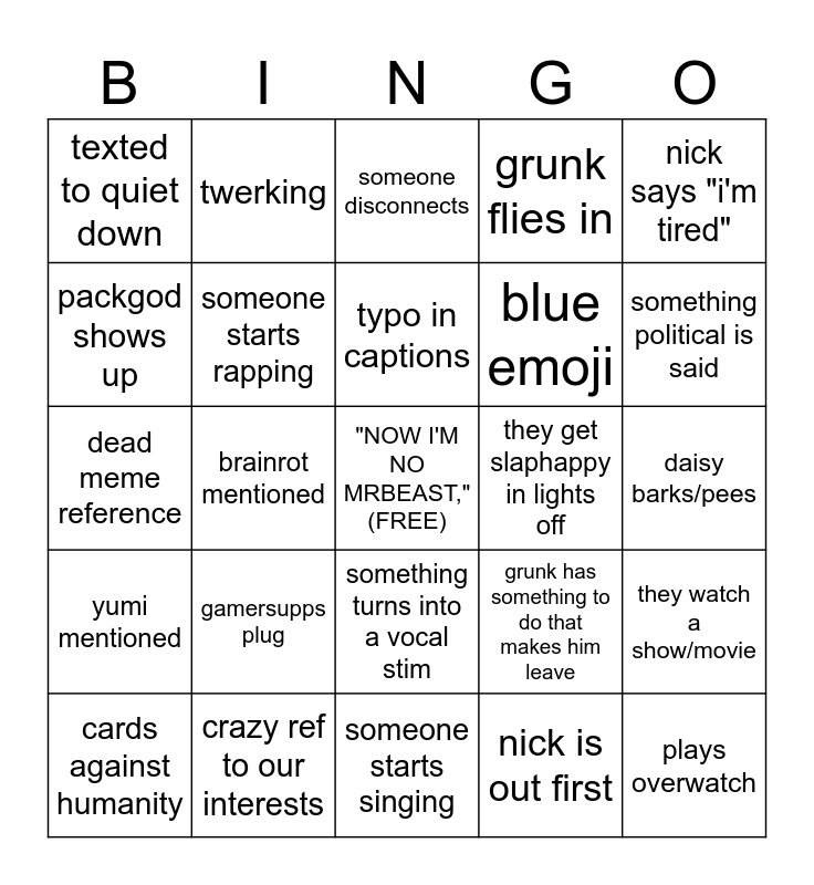 This bingo card has a free space and 45 words: "hawk tuah", plays overwatch, grunk omegle, cards against humanity, black market challenge, nick is out first, someone disconnects, jschlatt [SPECIL GUEST], nick says "i'm tired", crazy ref to our interests, grunk flies in, they get slaphappy in lights off, something turns into a vocal stim, gamersupps plug, something cancellable happens, someone starts singing, CRAZY licensed song starts playing, dead meme reference, someone genuinely crashes out, something political is said, twerking, someone doordashes food, someone starts playing an instrument, texted to quiet down, ryley walks in or asmrs the door, daisy barks/pees, el diablo past 12am, someone leaves unfairly, grunk has something to do that makes him leave, yumi mentioned, they talk to their discord server, they watch a show/movie, they watch youtube, adult substances used, someone gets a nickname, brainrot mentioned, something gay occurs, popcorn texts us, wait is mentioned, typo in captions, packgod shows up, blue emoji, black guy jamming gif, someone starts rapping and someone enters another persons room.