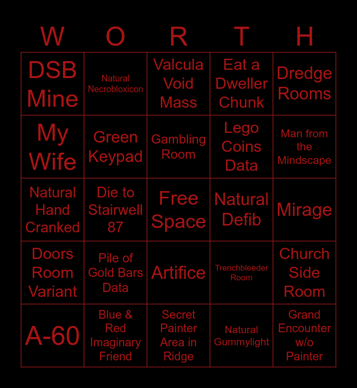 This bingo card has a free space and 24 words: Pile of Gold Bars Data, Blue & Red Imaginary Friend, Gambling Room, A-60, Dredge Rooms, DSB Mine, My Wife, Natural Necrobloxicon, Natural Defib, Artifice, Lego Coins Data, Natural Hand Cranked, Trenchbleeder Room, Church Side Room, Green Keypad, Natural Gummylight, Mirage, Valcula Void Mass, Man from the Mindscape, Die to Stairwell 87, Grand Encounter w/o Painter, Doors Room Variant, Eat a Dweller Chunk and Secret Painter Area in Ridge.