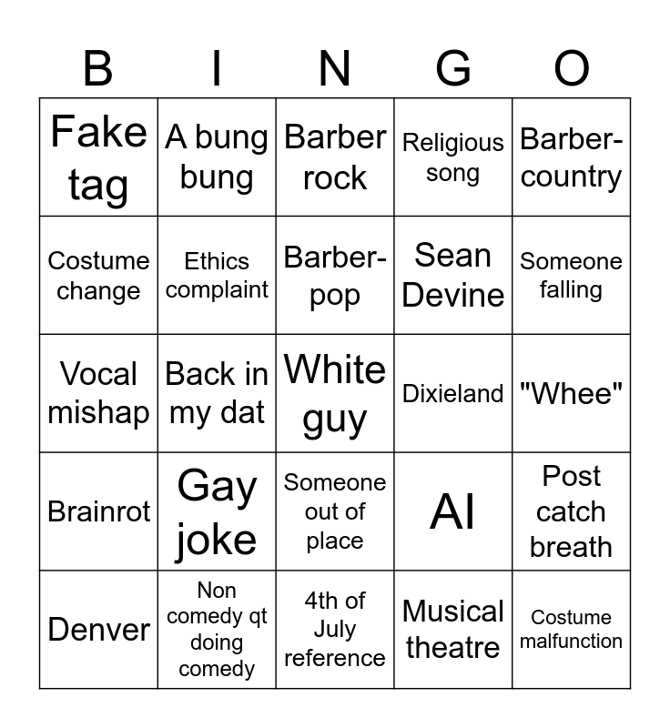 This bingo card has a free space and 24 words: Gay joke, Non comedy qt doing comedy, Barber-pop, Denver, Barber-country, Fake tag, Costume change, A bung bung, Dixieland, Someone out of place, Sean Devine, Vocal mishap, AI, Post catch breath, Ethics complaint, Musical theatre, "Whee", Barber rock, Someone falling, Back in my dat, Costume malfunction, Brainrot, Religious song and 4th of July reference.