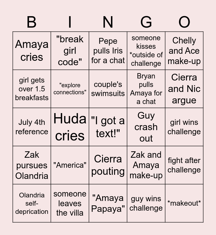 This bingo card has a free space and 30 words: someone leaves the villa, Girl crash out, Huda cries, "America", Amaya cries, Pepe pulls Iris for a chat, "explore connections", Cierra pouting, Guy crash out, "Amaya Papaya", girl wins challenge, *makeout*, guy wins challenge, someone doesn't get breakfast, Cierra and Nic argue, Olandria talks about Taylor, Zak and Amaya make-up, Zak pursues Olandria, "America", Chelly and Ace make-up, July 4th reference, Chelly and Huda fight, "break girl code", Bryan pulls Amaya for a chat, girl gets over 1.5 breakfasts, someone kisses *outside of challenge, fight after challenge, Olandria self-deprication, couple's swimsuits and Pepe mentions Hannah.