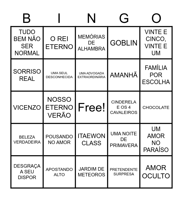 This bingo card has a free space and 31 words: JARDIM DE METEOROS, QUANDO O TELEFONE TOCA, NOSSO ETERNO VERÃO, RAINHA DAS LÁGRIMAS, TUDO BEM NÃO SER NORMAL, MEMÓRIAS DE ALHAMBRA, UMA SEUL DESCONHECIDA, UMA NOITE DE PRIMAVERA, CINDERELA E OS 4 CAVALEIROS, PRETENDENTE SURPRESA, CHOCOLATE, AMOR OCULTO, A LIÇÃO, TRINTA E NOVE, FAMÍLIA POR ESCOLHA, LOVELY RUNNER, UM AMOR NO PARAÍSO, POUSANDO NO AMOR, BELEZA VERDADEIRA, ITAEWON CLASS, VINTE E CINCO, VINTE E UM, THE GOOD BAD MOTHER, DESGRAÇA A SEU DISPOR, O REI ETERNO, AMANHÃ, SORRISO REAL, GOBLIN, VICENZO, APOSTANDO ALTO, UMA ADVOGADA EXTRAORDINÁRIA and SE A VIDA TE DER TANGERINAS.