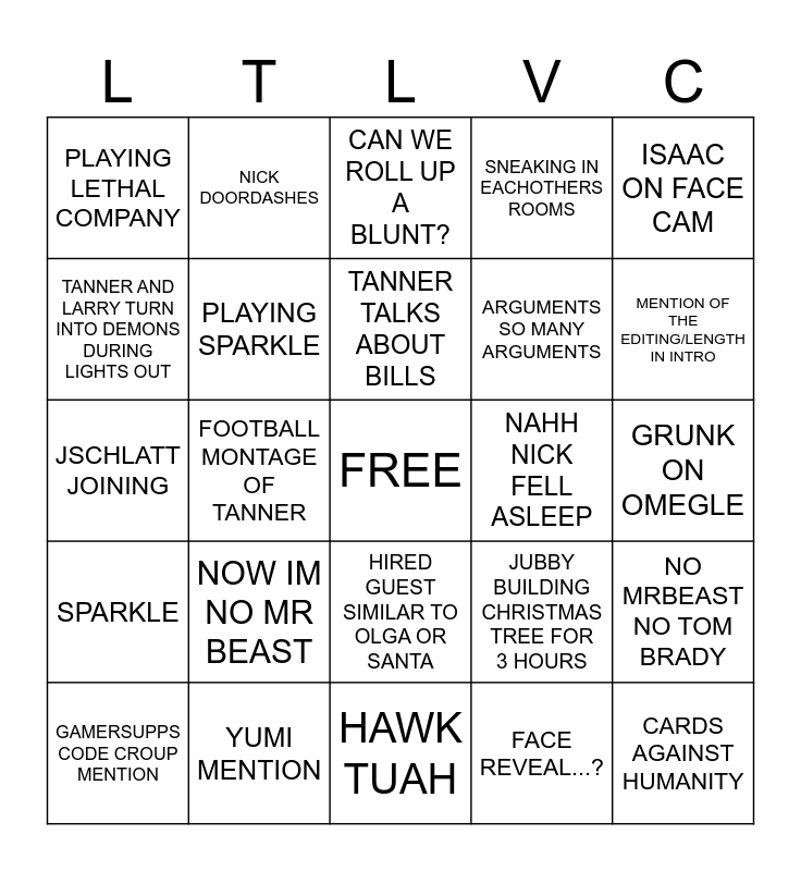 This bingo card has a free space and 24 words: NOW IM NO MR BEAST, YUMI MENTION, TANNER TALKS ABOUT BILLS, GAMERSUPPS CODE CROUP MENTION, ISAAC ON FACE CAM, PLAYING LETHAL COMPANY, TANNER AND LARRY TURN INTO DEMONS DURING LIGHTS OUT, NICK DOORDASHES, NAHH NICK FELL ASLEEP, HIRED GUEST SIMILAR TO OLGA OR SANTA, ARGUMENTS SO MANY ARGUMENTS, JSCHLATT JOINING, JUBBY BUILDING CHRISTMAS TREE FOR 3 HOURS, NO MRBEAST NO TOM BRADY, PLAYING SPARKLE, FACE REVEAL...?, GRUNK ON OMEGLE, CAN WE ROLL UP A BLUNT?, MENTION OF THE EDITING/LENGTH IN INTRO, FOOTBALL MONTAGE OF TANNER, CARDS AGAINST HUMANITY, SPARKLE, SNEAKING IN EACHOTHERS ROOMS and HAWK TUAH.