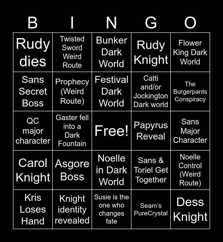 This bingo card has a free space and 24 words: Asgore Boss, Knight identity revealed, Festival Dark World, Kris Loses Hand, Flower King Dark World, Rudy dies, Sans Secret Boss, Twisted Sword Weird Route, Papyrus Reveal, Noelle in Dark World, Catti and/or Jockington Dark world, QC major character, Sans & Toriel Get Together, Noelle Control (Weird Route), Prophecy (Weird Route), Seam’s PureCrystal, Sans Major Character, Bunker Dark World, The Burgerpants Conspiracy, Gaster fell into a Dark Fountain, Dess Knight, Carol Knight, Rudy Knight and Susie is the one who changes fate.