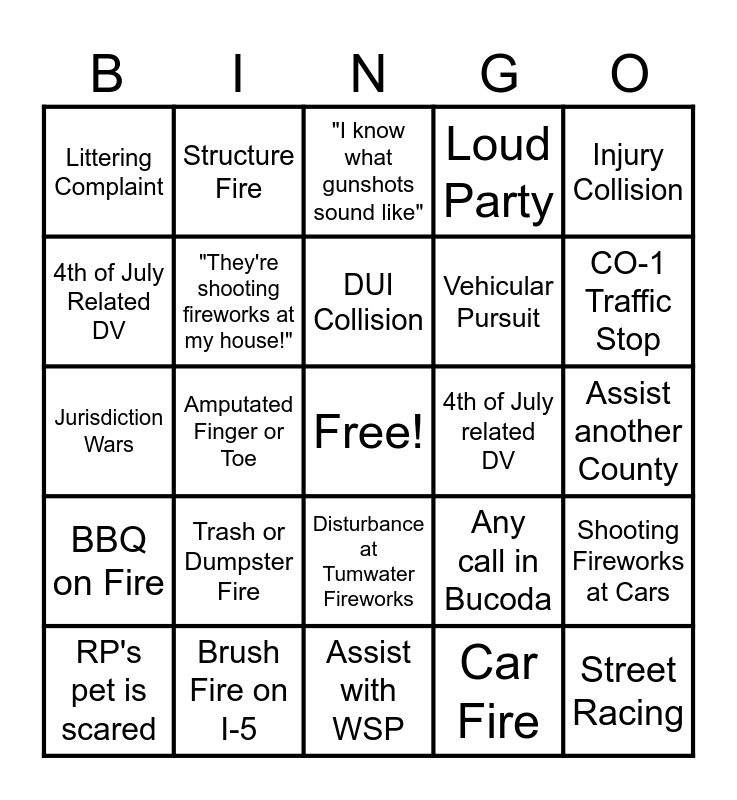 This bingo card has a free space and 24 words: Trash or Dumpster Fire, Brush Fire on I-5, DUI Collision, RP's pet is scared, Injury Collision, Littering Complaint, 4th of July Related DV, Structure Fire, 4th of July related DV, Disturbance at Tumwater Fireworks, Vehicular Pursuit, Jurisdiction Wars, Any call in Bucoda, Shooting Fireworks at Cars, "They're shooting fireworks at my house!", Car Fire, Assist another County, "I know what gunshots sound like", CO-1 Traffic Stop, Amputated Finger or Toe, Street Racing, BBQ on Fire, Loud Party and Assist with WSP.