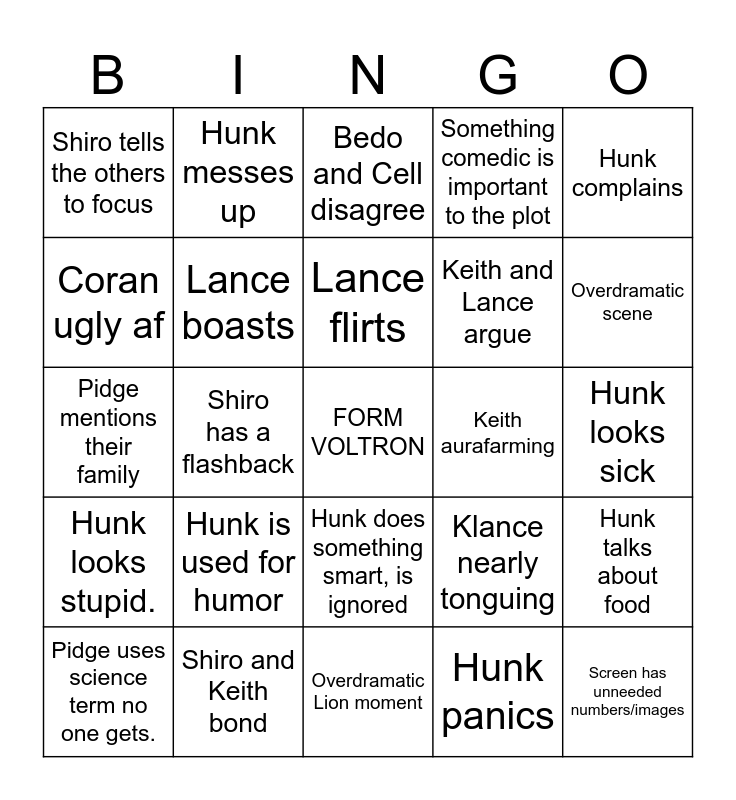 This bingo card has 25 words: Hunk is used for humor, Overdramatic Lion moment, Lance flirts, Pidge uses science term no one gets., Hunk complains, Shiro tells the others to focus, Coran ugly af, Hunk messes up, Keith aurafarming, Hunk does something smart, is ignored, Keith and Lance argue, Pidge mentions their family, Klance nearly tonguing, Hunk talks about food, Lance boasts, Screen has unneeded numbers/images, Hunk looks sick, Bedo and Cell disagree, Overdramatic scene, Shiro has a flashback, FORM VOLTRON, Shiro and Keith bond, Hunk looks stupid., Something comedic is important to the plot and Hunk panics.