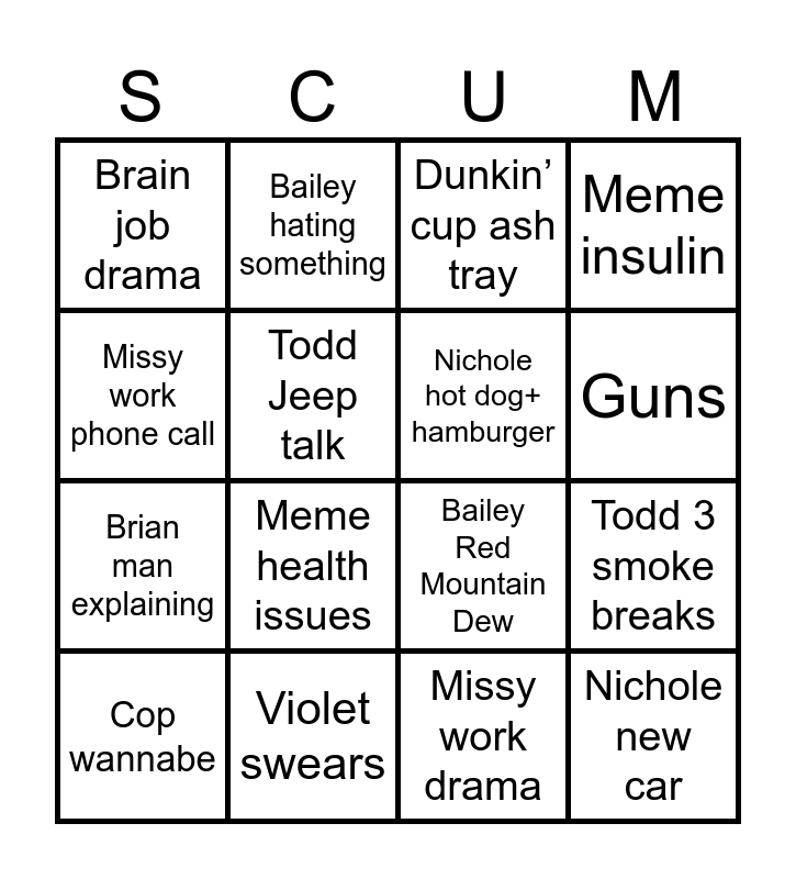 This bingo card has 16 words: Violet swears, Todd 3 smoke breaks, Dunkin’ cup ash tray, Brain job drama, Brian man explaining, Bailey hating something, Bailey Red Mountain Dew, Missy work drama, Missy work phone call, Todd Jeep talk, Cop wannabe, Meme insulin, Meme health issues, Guns, Nichole hot dog+ hamburger and Nichole new car.