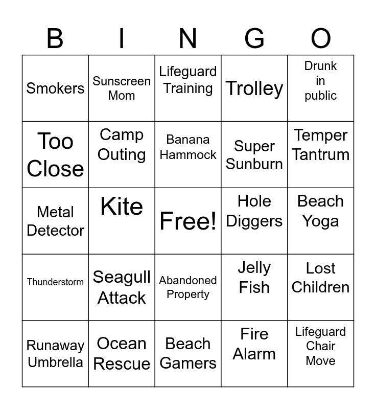 This bingo card has a free space and 24 words: Seagull Attack, Ocean Rescue, Banana Hammock, Runaway Umbrella, Drunk in public, Smokers, Too Close, Sunscreen Mom, Hole Diggers, Abandoned Property, Super Sunburn, Metal Detector, Jelly Fish, Lost Children, Camp Outing, Fire Alarm, Beach Yoga, Lifeguard Training, Temper Tantrum, Kite, Lifeguard Chair Move, Thunderstorm, Trolley and Beach Gamers.