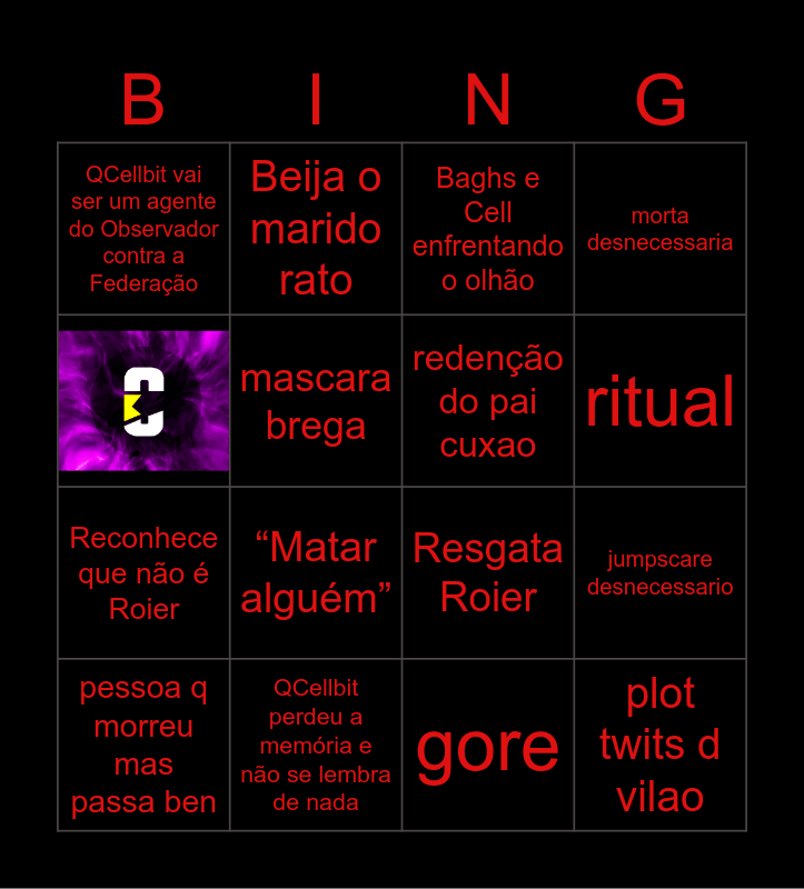 This bingo card has 1 images and 36 words: telefone toca, porta fecha sozinha, choro, redenção do pai cuxao, prota tndo epifania, vulto, ritual, good ending, grito, jumpscare desnecessario, morta desnecessaria, pessoa q morreu mas passa ben, gore, mascara brega, plot twits d vilao, Ele e baghs achando que os filhos são ilusões, Baghs e Cell enfrentando o olhão, Achar que a ilha nova é uma simulação, QCellbit perdeu a memória e não se lembra de nada, QCellbit vai ser um agente do Observador contra a Federação, “Matar alguém”, Tentar matar um dos ovos novos, Ele vai estar preso em algum lugar, Vários ossos e restos dos corpos dos olhudos que ele comeu, Ele vai estar alucinando com o marido e o filho, Beija o marido rato, Tentar matar o Richas e a Pomme, Um ou os 2 ovos perdem uma vida, Eles se arrependem e voltam pra ilha, mas não antes de se vingarem do Watcher fazendo ele experimentar o próprio remédio no Purgatório, Percebe que não é Roier, CINTA 1 e 2 foram alucinações, Resgata Roier, Cellbit e Bags são resgatados por Phylza, Pomme e Richas vão sozinhos, Reconhece que não é Roier and Toca radiohead.
