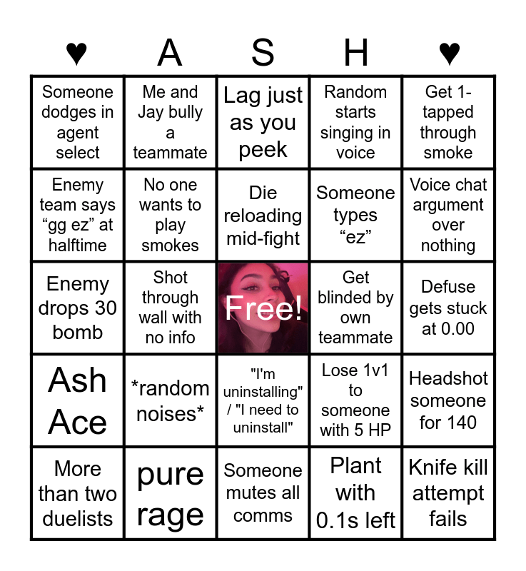 This bingo card has a free space and 55 words: Instalock Reyna, More than two duelists, Two players fight over the agent, Someone dodges in agent select, Someone mutes all comms, I die standing behind two teammates, No one wants to play smokes, Teammate forces op on eco, Someone types “ez”, Someone rage quits mid-game, Random starts singing in voice, “Rotate?” debate mid-round, Teammate throws, Someone types “uninstall”, Sage refuses to heal anyone, Smurfs, Get 1-tapped through smoke, Shot through wall with no info, Ult wasted with no kills, Knife kill attempt fails, Get blinded by own teammate, Kill traded instantly, Lose 1v1 to someone with 5 HP, Lag just as you peek, Flashbang hits no one, Die reloading mid-fight, Plant with 0.1s left, Fall off ledge to death, Defuse gets stuck at 0.00, Headshot someone for 140, Enemy Jett top frags, Enemy has two ops, Killjoy turret never misses, Cypher camera finds you instantly, Enemy team says “gg ez” at halftime, Enemy drops 30 bomb, Get wall-banged, Ash Ace, Top frag = loss, Ash: "wtf are you doing", Me and Jay bully a teammate, Ash: "what the helly", Jay follows up "helliante", Ash: "_____ coded", *random noises*, pure rage, flame a troll in chat, “Diff” typed, Player types “?” in team chat, Voice chat argument over nothing, Someone says “I’m not trying (anymore)”, Clutch, "I'm so lit", "I'm uninstalling" / "I need to uninstall" and Someone asks for my skin.