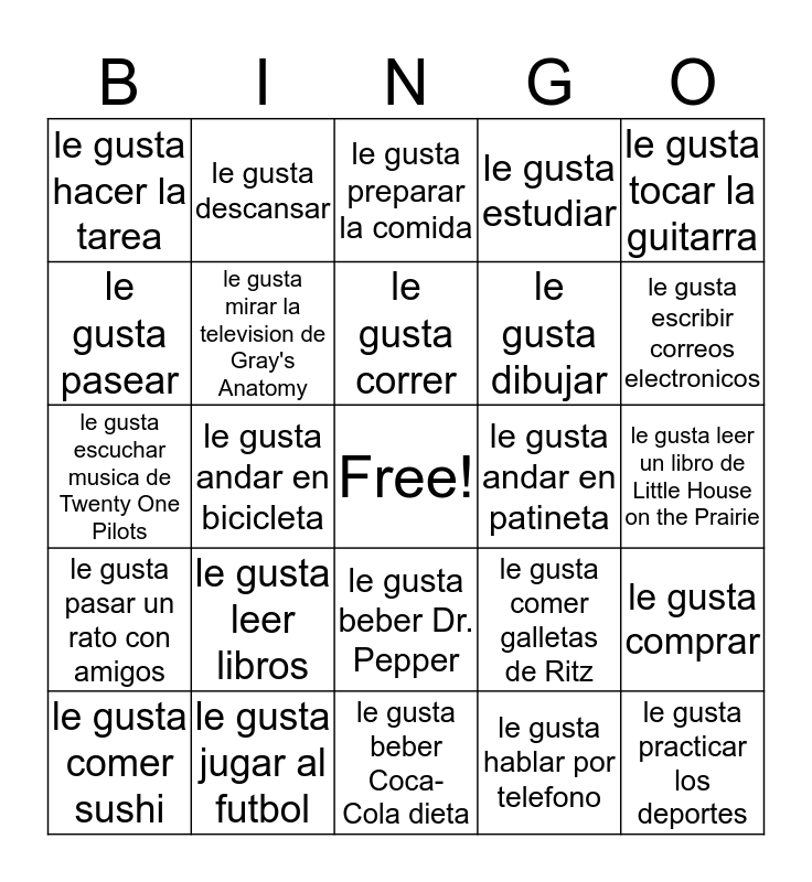 This bingo card has a free space and 24 words: le gusta leer libros, le gusta jugar al futbol, le gusta correr, le gusta comer sushi, le gusta tocar la guitarra, le gusta hacer la tarea, le gusta pasear, le gusta descansar, le gusta andar en patineta, le gusta beber Dr. Pepper, le gusta dibujar, le gusta escuchar musica de Twenty One Pilots, le gusta comer galletas de Ritz, le gusta comprar, le gusta mirar la television de Gray's Anatomy, le gusta hablar por telefono, le gusta leer un libro de Little House on the Prairie, le gusta preparar la comida, le gusta escribir correos electronicos, le gusta andar en bicicleta, le gusta practicar los deportes, le gusta pasar un rato con amigos, le gusta estudiar and le gusta beber Coca-Cola dieta.