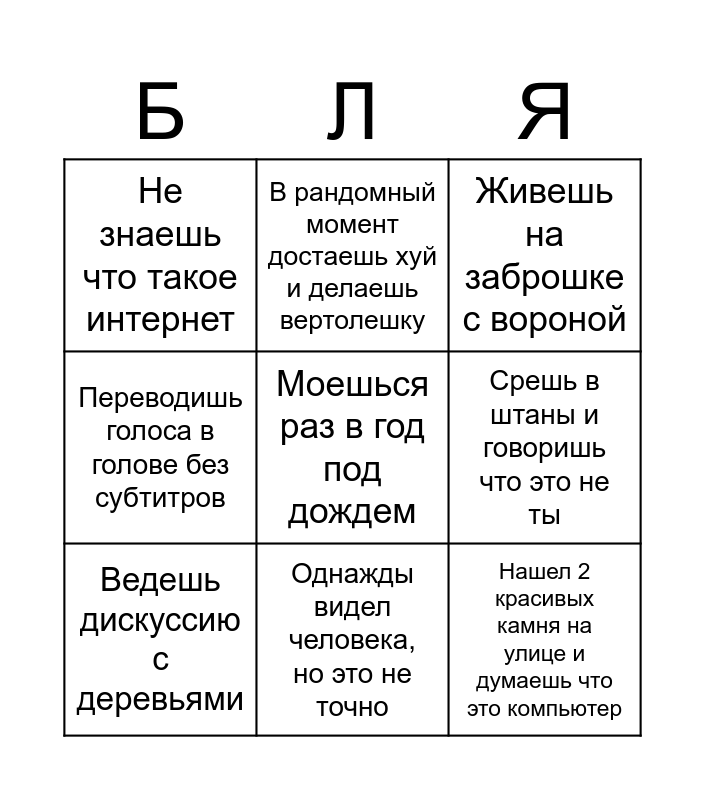 This bingo card has a free space and 8 words: Срешь в штаны и говоришь что это не ты, Живешь на заброшке с вороной, В рандомный момент достаешь хуй и делаешь вертолешку, Ведешь дискуссию с деревьями, Не знаешь что такое интернет, Нашел 2 красивых камня на улице и думаешь что это компьютер, Переводишь голоса в голове без субтитров and Однажды видел человека, но это не точно.