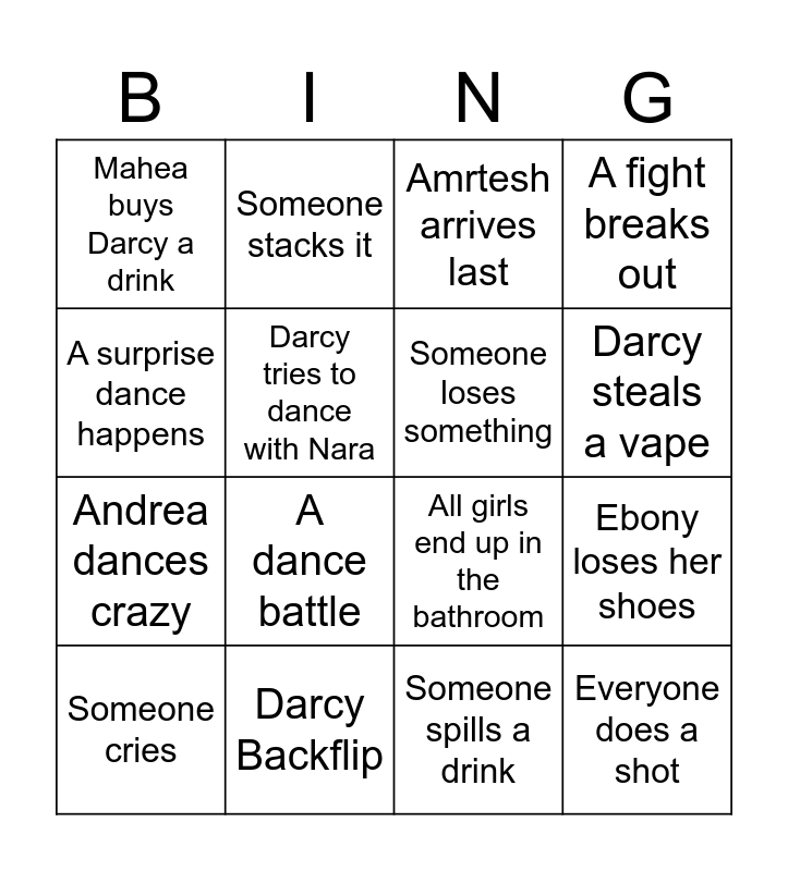 This bingo card has 16 words: Darcy Backflip, Ebony loses her shoes, Amrtesh arrives last, Mahea buys Darcy a drink, Andrea dances crazy, Someone stacks it, All girls end up in the bathroom, Someone spills a drink, A surprise dance happens, Darcy tries to dance with Nara, Someone cries, A fight breaks out, A dance battle, Darcy steals a vape, Someone loses something and Everyone does a shot.