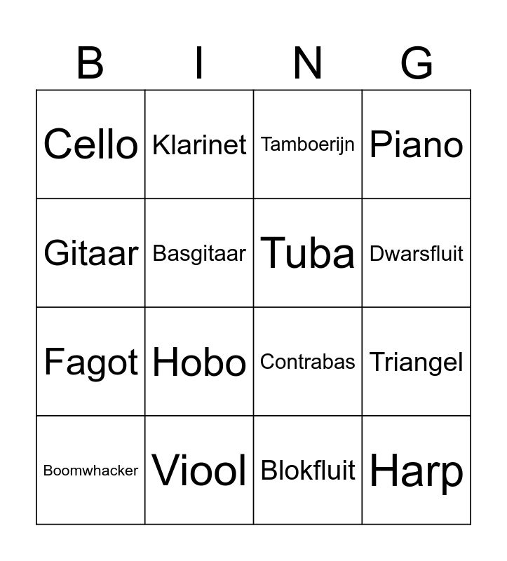 This bingo card has 20 words: Triangel, Handtrom, Tamboerijn, Sambabal, Boomwhacker, Gitaar, Viool, Cello, Fagot, Klarinet, Hobo, Contrabas, Basgitaar, Harp, Tuba, Hoorn, Dwarsfluit, Piano, Blokfluit and Saxofoon.