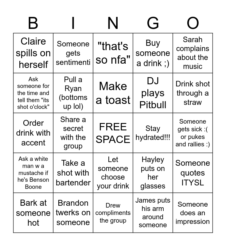 This bingo card has a free space and 24 words: Take a shot with bartender, Brandon twerks on someone, Make a toast, Bark at someone hot, Sarah complains about the music, Claire spills on herself, Ask someone for the time and tell them "its shot o'clock", Someone gets sentimenti, Stay hydrated!!!, Let someone choose your drink, DJ plays Pitbull, Order drink with accent, Hayley puts on her glasses, Someone quotes ITYSL, Pull a Ryan (bottoms up lol), James puts his arm around someone, Someone gets sick :( or pukes and rallies :), "that's so nfa", Drink shot through a straw, Share a secret with the group, Someone does an impression, Ask a white man w a mustache if he's Benson Boone, Buy someone a drink ;) and Drew compliments the group.
