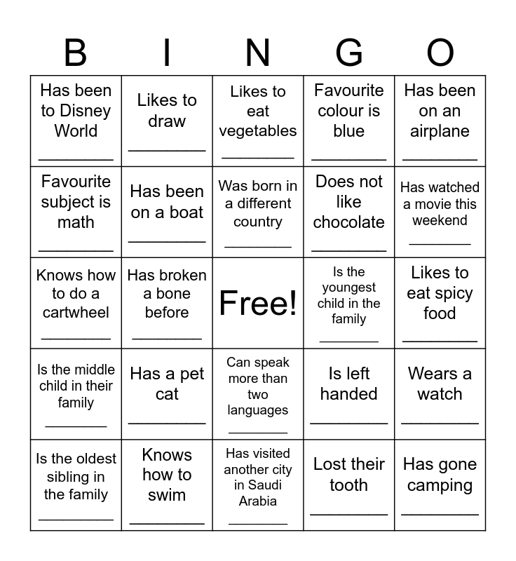 This bingo card has a free space and 24 words: Has a pet cat ________, Knows how to swim ________, Was born in a different country ________, Is the oldest sibling in the family _________, Has been on an airplane ________, Has been to Disney World ________, Favourite subject is math ________, Likes to draw ________, Is the youngest child in the family ________, Can speak more than two languages ________, Does not like chocolate ________, Knows how to do a cartwheel ________, Is left handed ________, Wears a watch ________, Has been on a boat ________, Lost their tooth ________, Likes to eat spicy food ________, Likes to eat vegetables ________, Has watched a movie this weekend ________, Has broken a bone before ________, Has gone camping ________, Is the middle child in their family ________, Favourite colour is blue ________ and Has visited another city in Saudi Arabia ________.