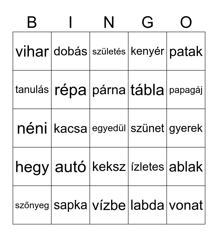 This bingo card has 97 words: kutya, nyuszi, boci, kacsa, csiga, béka, lóca, hangya, felhő, napos, eső, szél, erdő, hegy, tóka, vihar, patak, virág, asztal, szék, tükör, kulcs, lámpa, polc, ajtó, párna, szőnyeg, ablak, alma, körte, répa, kenyér, vajat, tejbe, vízbe, keksz, kakaó, leves, anya, néni, bácsi, gyerek, fiú, labda, autó, vonat, kocka, rajz, olló, hinta, torony, eszik, iszik, futás, úszik, alszik, ugrik, dobás, keres, hozok, piros, kékes, zöld, sárga, barna, kabát, cipő, póló, zokni, sapka, tábla, könyv, cerka, padka, óvoda, suli, terem, tollat, szünet, játék, elefánt, papagáj, kerékpár, szivárvány, pillangó, vasárnap, egyedül, könyvtáros, pénztárca, hétvége, születés, barátság, tolltartó, ízletes, tanulás, elromlott and nyomtalan.