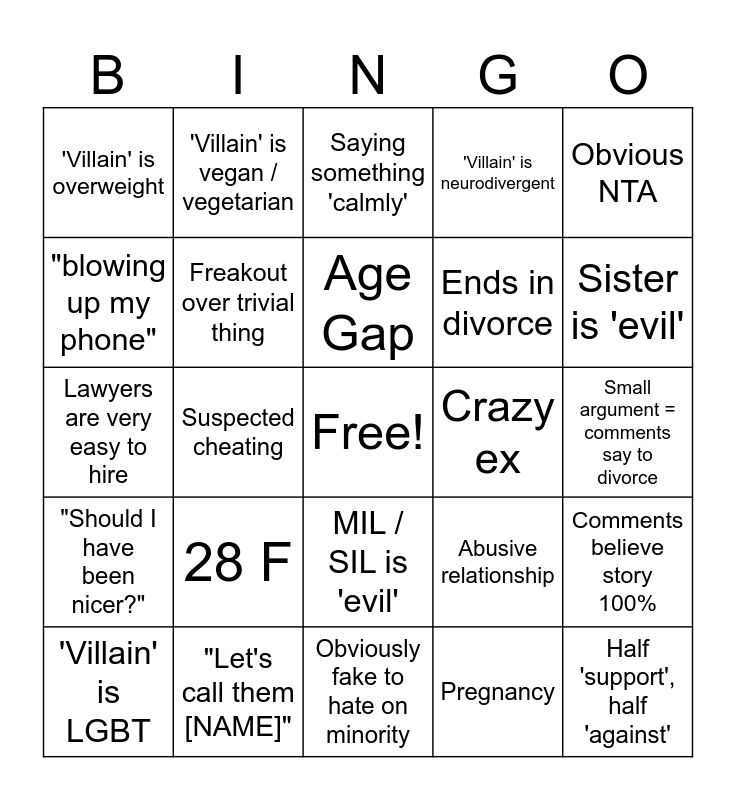 This bingo card has a free space and 24 words: 28 F, "Let's call them [NAME]", Age Gap, 'Villain' is LGBT, Obvious NTA, 'Villain' is overweight, "blowing up my phone", 'Villain' is vegan / vegetarian, Crazy ex, MIL / SIL is 'evil', Ends in divorce, Lawyers are very easy to hire, Abusive relationship, Comments believe story 100%, Freakout over trivial thing, Pregnancy, Small argument = comments say to divorce, Saying something 'calmly', Sister is 'evil', Suspected cheating, Half 'support', half 'against', "Should I have been nicer?", 'Villain' is neurodivergent and Obviously fake to hate on minority.
