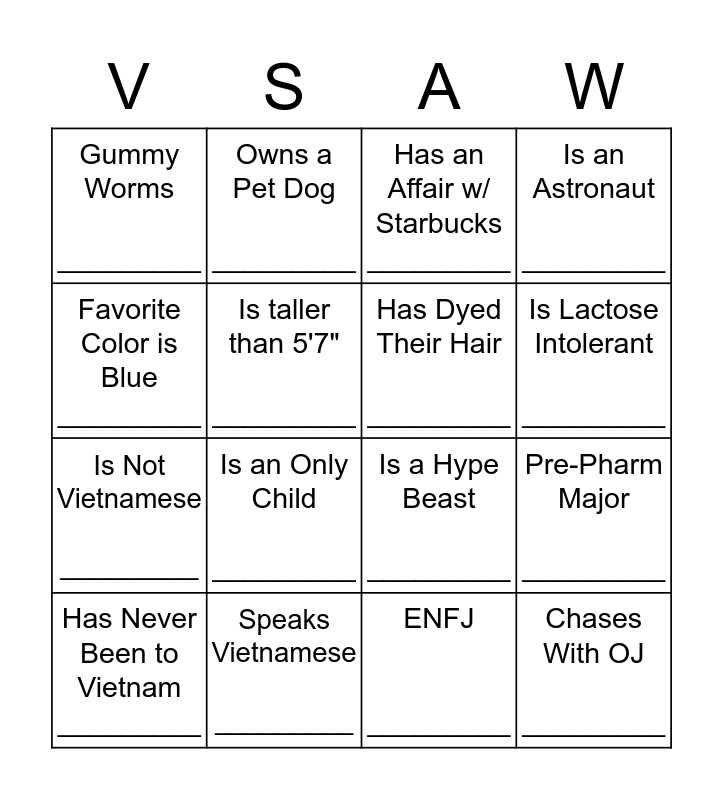 This bingo card has 16 words: Speaks Vietnamese _________, Pre-Pharm Major _________, Has an Affair w/ Starbucks _________, Gummy Worms _________, Is Not Vietnamese _________, Owns a Pet Dog _________, Is a Hype Beast _________, ENFJ _________, Favorite Color is Blue _________, Is taller than 5'7" _________, Has Never Been to Vietnam _________, Is an Astronaut _________, Is an Only Child _________, Is Lactose Intolerant _________, Has Dyed Their Hair _________ and Chases With OJ _________.