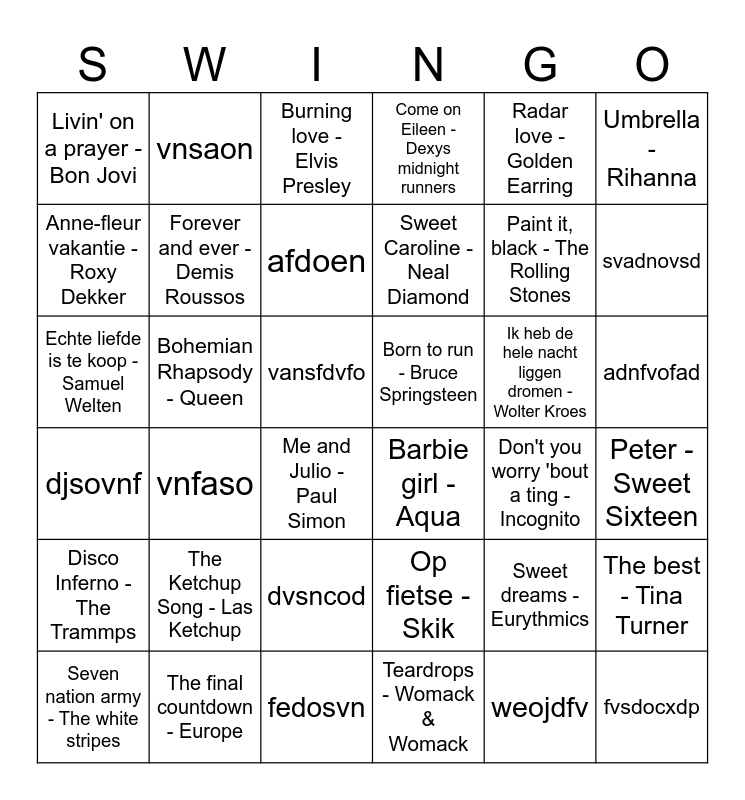 This bingo card has 147 words: dkwl, sdlfjbn, sdfnhodbvgpg-w, owjdf, weojdfv, djsovnf, sodfvnc, wfodfjsvm, wfdopsfjnv, fdsjovcjm, oasdnv, wodfnsv, fwodsnjv, fdwosnv, fwosdvn, fdwosvn, fedosvn, fdvsonbfngvf, Free!, dsfa, fvjnccn, vnfaso, asvdno, adsnvo, vndf o, svadnovsd, vnsaon, vdsanovsd, vdnsovnvd, dvsaon, dvsncod, vndaodsn, vadfon, vansfdvfo, fvsdocxdp, nvfovasd, nvadfo, addavl, afdoen, avdofvj, adfljv, avfdonvfa, adnfvofad, adfnvoao, afndovnvf, grotgfbv, fbgvth, bgsfdgthga, tag, refbdgv, rfebds, refbdgbfv, Me and Julio - Paul Simon, Paradise by the dashboard light - Meat Loaf, Kung Fu Fighting - Carl Douglas, Take a chance on me - ABBA, American Pie - Don McClean, Hotel California - Eagles, Dreadlock holiday - 10CC, Rock the boat - The hues corporation, Burning love - Elvis Presley, Disco Inferno - The Trammps, Play that funky music - Wild Cherry, Never can say goodbye - Gloria Gaynor, Denis - Blondie, Bohemian Rhapsody - Queen, Born to run - Bruce Springsteen, More than a feeling - Boston, All night long - Lionel Richie, Kids in America - Kim Wilde, Africa - TOTO, The final countdown - Europe, Livin' on a prayer - Bon Jovi, Wake me up before you go-go - WHAM!, Don't you want me - The human league, Billie Jean - Michael Jackson, Every little thing she does is magic - The Police, Eye of the tiger - Survivor, Sweet dreams - Eurythmics, Come on Eileen - Dexys midnight runners, Material girl - Madonna, The Reflex - Duran Duran, Modern love - David Bowie, Never gonna give you up - Rick Astley, Teardrops - Womack & Womack, Wannabe - Spice girls, Walk this way - Run-D.M.C. & Aerosmith, ... baby one more time - Britney Spears, Sweat (a la la la la long) - Inner circle, Don't you worry 'bout a ting - Incognito, Informer - Snow, Would I lie to you - Charles & Eddie, Freed from desire - Gala, Smells like teen spirit - Nirvana, Barbie girl - Aqua, Two princes - Spin doctors, Saturday night - Whigfield, Boom-bastic - Shaggy, Unwritten - Natasha Beddingfield, One more time - Daft Punk, I'm like a bird - Nelly Furtado, Seven nation army - The white stripes, Umbrella - Rihanna, Don't cha - The pussycat dolls, Fireball - Pitbull, Bad guy - Billie Eilish, Uptown Funk - Bruno Mars, Zij weet het - Tino Martin, Entourage - Bankzitters, België - Het goede doel, Amsterdam - Flemming, Banger hart - Rob de Nijs, Anne-fleur vakantie - Roxy Dekker, Ik heb de hele nacht liggen dromen - Wolter Kroes, Baila bailaba - Kinderen voor kinderen, Sweet Caroline - Neal Diamond, The best - Tina Turner, Echte liefde is te koop - Samuel Welten, Radar love - Golden Earring, Grrr.... ik ben een boze dino - Lil ones, ISAÏ, Paint it, black - The Rolling Stones, Light my fire - The doors, You really got me - The Kinks, Forever and ever - Demis Roussos, Mexico - De zangeres zonder naam, Het dorp - Wim Sonnenveld, Peter - Sweet Sixteen, Twee motten - Dorus, Sammy - Ramses Shaffy, Ironic - Alanis Morissette, Nothing compares 2 U - Sinéad O'Connor, Rainbow in the sky - Paul Elstak, We're going to ibiza! - Vengaboys, Whole again - Atomic Kitten, The Ketchup Song - Las Ketchup, La camisa negra - Juanes, J'aime La Vie - Sandra Kim, Je bent niet hip - Patricia Paay, Du - Peter Maffay, Ich bin wie du - Marianne Rosenberg, Atemlos durch die Nacht - Helene Fischer, Wêr bisto - Twarres, In Nije Dei - De kast, Op fietse - Skik, In de blote kont - Mooi Wark, Hier kom ik weg - Daniël Lohues and Jelle - Slimme Schemer & Tido.