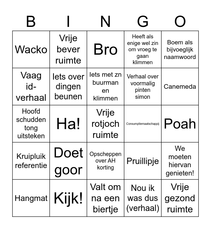 This bingo card has a free space and 24 words: Doet goor, Kijk!, Iets met zn buurman en klimmen, Hangmat, Boem als bijvoeglijk naamwoord, Wacko, Vaag id-verhaal, Vrije bever ruimte, Consumptiemaatschappij, Opscheppen over AH korting, Verhaal over voormalig pinten simon, Hoofd schudden tong uitsteken, Pruillipje, We moeten hiervan genieten!, Iets over dingen beunen, Nou ik was dus (verhaal), Poah, Bro, Canemeda, Ha!, Vrije gezond ruimte, Kruipluik referentie, Heeft als enige wel zin om vroeg te gaan klimmen and Valt om na een biertje.
