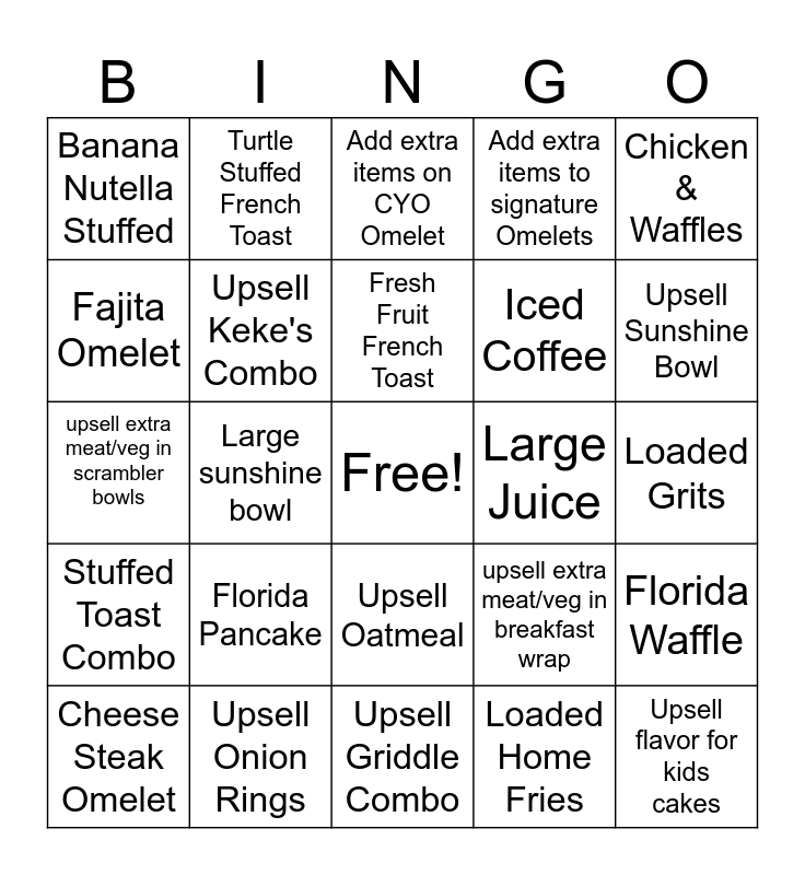 This bingo card has a free space and 24 words: Florida Pancake, Upsell Onion Rings, Fresh Fruit French Toast, Cheese Steak Omelet, Chicken & Waffles, Banana Nutella Stuffed, Fajita Omelet, Turtle Stuffed French Toast, Large Juice, Upsell Oatmeal, Iced Coffee, upsell extra meat/veg in scrambler bowls, upsell extra meat/veg in breakfast wrap, Florida Waffle, Upsell Keke's Combo, Loaded Home Fries, Loaded Grits, Add extra items on CYO Omelet, Upsell Sunshine Bowl, Large sunshine bowl, Upsell flavor for kids cakes, Stuffed Toast Combo, Add extra items to signature Omelets and Upsell Griddle Combo.