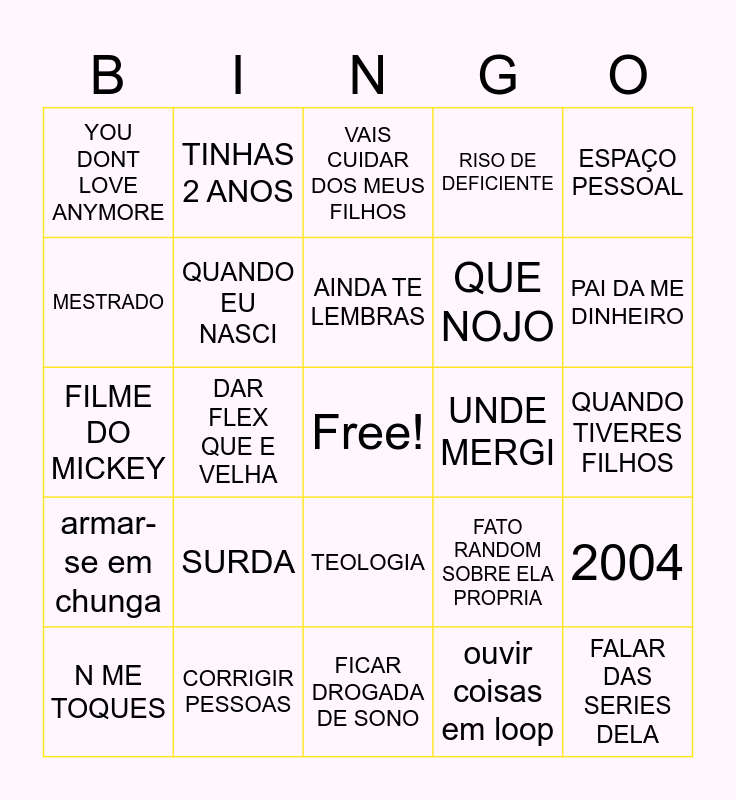 This bingo card has a free space and 24 words: SURDA, CORRIGIR PESSOAS, AINDA TE LEMBRAS, N ME TOQUES, ESPAÇO PESSOAL, YOU DONT LOVE ANYMORE, MESTRADO, TINHAS 2 ANOS, UNDE MERGI, TEOLOGIA, QUE NOJO, FILME DO MICKEY, FATO RANDOM SOBRE ELA PROPRIA, 2004, QUANDO EU NASCI, ouvir coisas em loop, QUANDO TIVERES FILHOS, VAIS CUIDAR DOS MEUS FILHOS, PAI DA ME DINHEIRO, DAR FLEX QUE E VELHA, FALAR DAS SERIES DELA, armar-se em chunga, RISO DE DEFICIENTE and FICAR DROGADA DE SONO.
