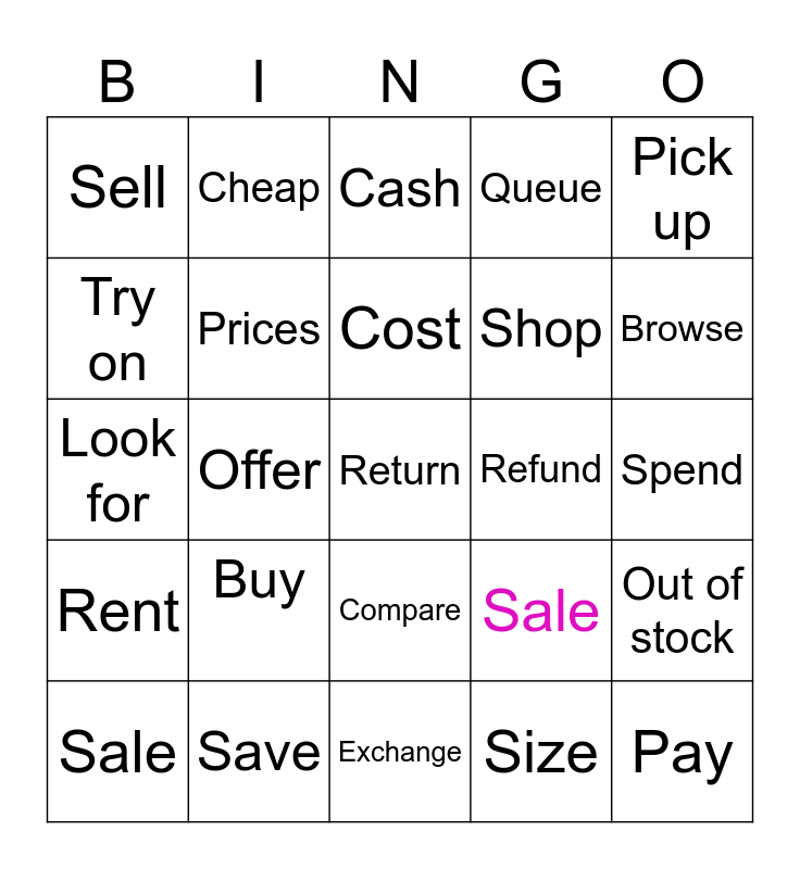 This bingo card has 25 words: Buy, Exchange, Cost, Sale, Pick up, Sell, Try on, Cheap, Refund, Compare, Shop, Look for, Sale, Out of stock, Prices, Pay, Spend, Cash, Browse, Offer, Return, Save, Rent, Queue and Size.