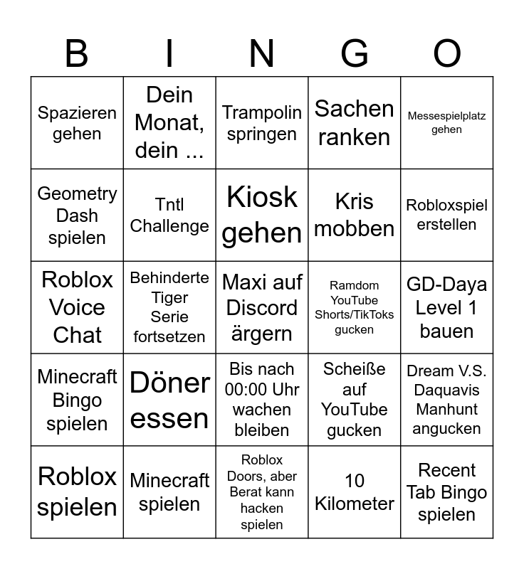 This bingo card has a free space and 24 words: Döner essen, Minecraft spielen, Kiosk gehen, Roblox spielen, Messespielplatz gehen, Spazieren gehen, Geometry Dash spielen, Dein Monat, dein ..., Ramdom YouTube Shorts/TikToks gucken, Bis nach 00:00 Uhr wachen bleiben, Kris mobben, Roblox Voice Chat, Scheiße auf YouTube gucken, Dream V.S. Daquavis Manhunt angucken, Tntl Challenge, 10 Kilometer, GD-Daya Level 1 bauen, Trampolin springen, Robloxspiel erstellen, Behinderte Tiger Serie fortsetzen, Recent Tab Bingo spielen, Minecraft Bingo spielen, Sachen ranken and Roblox Doors, aber Berat kann hacken spielen.