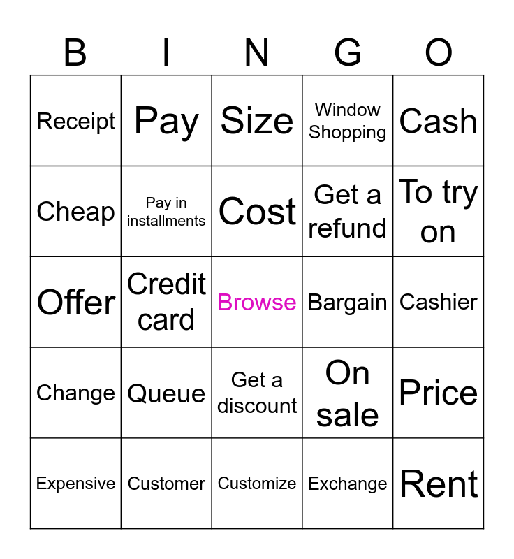 This bingo card has a free space and 24 words: Queue, Customer, Cost, Expensive, Cash, Receipt, Cheap, Pay, Bargain, Get a discount, Get a refund, Offer, On sale, Price, Pay in installments, Exchange, Cashier, Size, To try on, Credit card, Rent, Change, Window Shopping and Customize.
