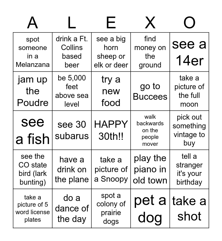 This bingo card has a free space and 24 words: have a drink on the plane, do a dance of the day, try a new food, take a picture of 5 word license plates, see a 14er, spot someone in a Melanzana, jam up the Poudre, drink a Ft. Collins based beer, walk backwards on the people mover, take a picture of a Snoopy, go to Buccees, see a fish, play the piano in old town, tell a stranger it's your birthday, be 5,000 feet above sea level, pet a dog, pick out something vintage to buy, see a big horn sheep or elk or deer, take a picture of the full moon, see 30 subarus, take a shot, see the CO state bird (lark bunting), find money on the ground and spot a colony of prairie dogs.
