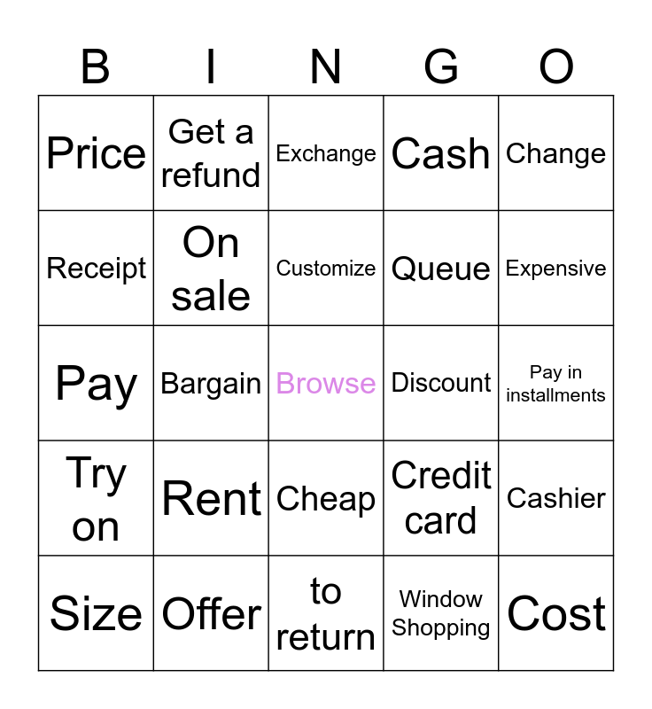 This bingo card has a free space and 24 words: Rent, Offer, Customize, Size, Change, Price, Receipt, Get a refund, Discount, Cheap, Queue, Pay, Credit card, Cashier, On sale, Window Shopping, Pay in installments, Exchange, Expensive, Bargain, Cost, Try on, Cash and to return.