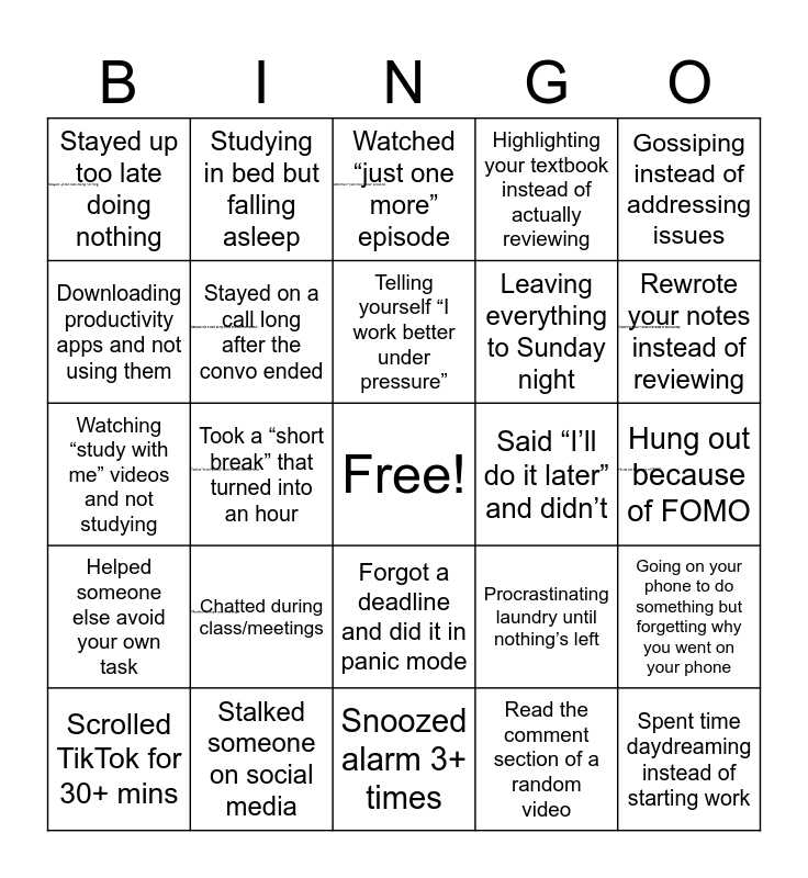 This bingo card has 9 images, a free space and 29 words: Scrolled TikTok for 30+ mins, Jumped between tasks without finishing one, Took a “short break” that turned into an hour, Slept in and rushed everything after, Stayed up too late doing nothing, Watched “just one more” episode, Stayed on a call long after the convo ended, Chatted during class/meetings, Said “I’ll do it later” and didn’t, Stalked someone on social media, Hung out because of FOMO, Spent time daydreaming instead of starting work, Snoozed alarm 3+ times, Read the comment section of a random video, Rewrote your notes instead of reviewing, Waited for motivation to “kick in”, Forgot a deadline and did it in panic mode, Helped someone else avoid your own task, Gossiping instead of addressing issues, Watching “study with me” videos and not studying, Procrastinating laundry until nothing’s left, Making a study schedule you never follow, Leaving everything to Sunday night, Downloading productivity apps and not using them, Highlighting your textbook instead of actually reviewing, Studying in bed but falling asleep, Going on your phone to do something but forgetting why you went on your phone, Telling yourself “I work better under pressure” and Planning your life at 3 am when you had a burst of energy but never following the plan in the morning.