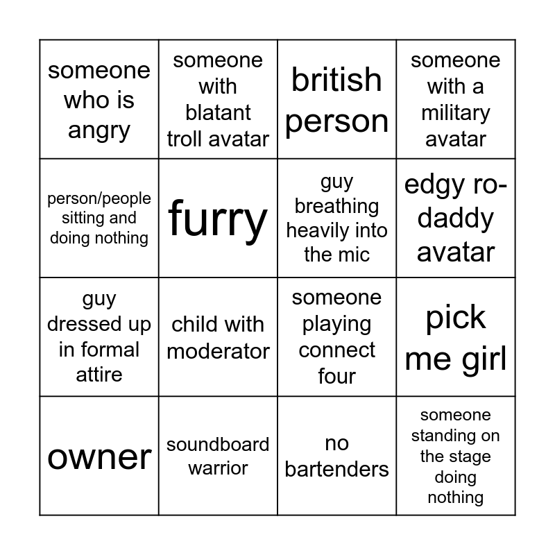 This bingo card has 30 words: a child in voice chat, someone forcing their voice, pick me girl, person that sounds like nerd emoji, someone who is angry, british person, guy breathing heavily into the mic, someone eating on mic, soundboard warrior, moderator/staff member, no bartenders, owner, security arresting someone for not wearing a shirt, moderators using excessive punctuation, child with moderator, Fin getting arrested, someone playing shitty music, someone standing on the stage doing nothing, someone hitting on Persephone, person/people sitting and doing nothing, someone playing connect four, someone with over 300 hours on the game, someone with blatant troll avatar, guy dressed up in formal attire, furry, someone with a military avatar, videogame/show avatar, suggestive female avatar, edgy ro-daddy avatar and horror/gore avatar.