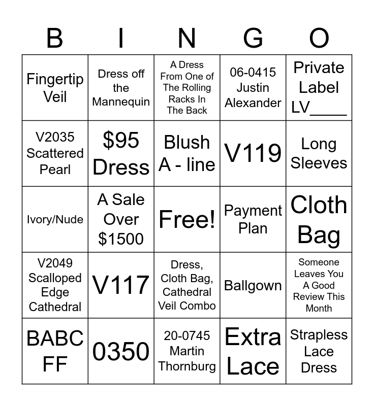 This bingo card has a free space and 24 words: V117, 0350, Blush A - line, BABC FF, Private Label LV____, Fingertip Veil, V2035 Scattered Pearl, Dress off the Mannequin, Payment Plan, Dress, Cloth Bag, Cathedral Veil Combo, V119, Ivory/Nude, Ballgown, Someone Leaves You A Good Review This Month, $95 Dress, Extra Lace, Cloth Bag, A Dress From One of The Rolling Racks In The Back, Long Sleeves, A Sale Over $1500, Strapless Lace Dress, V2049 Scalloped Edge Cathedral, 06-0415 Justin Alexander and 20-0745 Martin Thornburg.