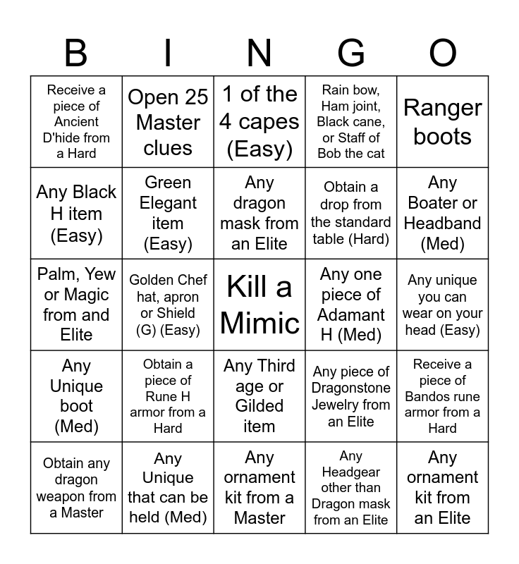 This bingo card has a free space and 27 words: Any piece of Dragonstone Jewelry from an Elite, Piece of Purple Elegant outfit (Med), Obtain a drop from the standard table (Hard), Any ornament kit from a Master, Any Black H item (Easy), 1 of the 4 capes (Easy), Open 25 Master clues, Any Unique boot (Med), Any one piece of Adamant H (Med), Receive a piece of Bandos rune armor from a Hard, Palm, Yew or Magic from and Elite, Rain bow, Ham joint, Black cane, or Staff of Bob the cat, Obtain any dragon weapon from a Master, Any Unique that can be held (Med), Any Boater or Headband (Med), Open any headpiece from a Master, Green Elegant item (Easy), Any dragon mask from an Elite, Obtain a piece of Rune H armor from a Hard, Receive a piece of Ancient D'hide from a Hard, Any unique you can wear on your head (Easy), Any Headgear other than Dragon mask from an Elite, Golden Chef hat, apron or Shield (G) (Easy), Any ornament kit from an Elite, Any Third age or Gilded item, Ranger boots and Ham Joint.