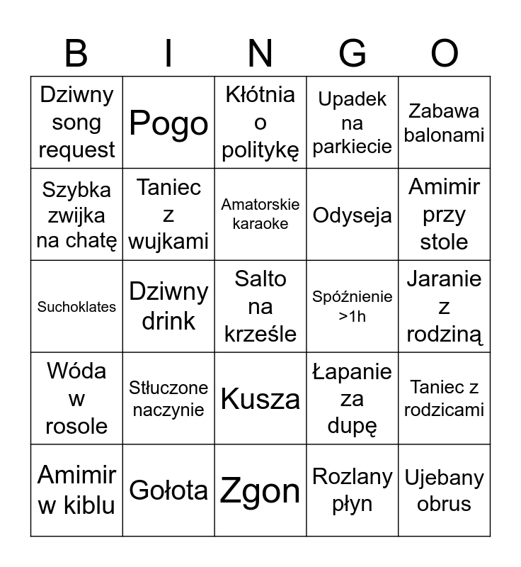This bingo card has 25 words: Wóda w rosole, Gołota, Salto na krześle, Rozlany płyn, Zabawa balonami, Dziwny song request, Pogo, Kłótnia o politykę, Spóźnienie >1h, Taniec z rodzicami, Szybka zwijka na chatę, Taniec z wujkami, Zgon, Łapanie za dupę, Amimir przy stole, Amimir w kiblu, Dziwny drink, Amatorskie karaoke, Odyseja, Jaranie z rodziną, Suchoklates, Stłuczone naczynie, Kusza, Upadek na parkiecie and Ujebany obrus.