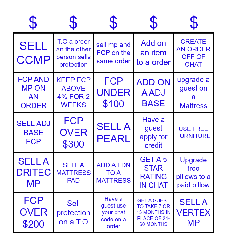 This bingo card has a free space and 24 words: SELL A MATTRESS PAD, Sell protection on a T.O, FCP UNDER $100, FCP OVER $200, CREATE AN ORDER OFF OF CHAT, SELL CCMP, FCP AND MP ON AN ORDER, T.O a order an the other person sells protection, Have a guest apply for credit, ADD A FDN TO A MATTRESS, ADD ON A ADJ BASE, SELL ADJ BASE FCP, GET A 5 STAR RATING IN CHAT, Upgrade free pillows to a paid pillow, KEEP FCP ABOVE 4% FOR 2 WEEKS, GET A GUEST TO TAKE 7 OR 13 MONTHS IN PLACE OF 21-60 MONTHS, USE FREE FURNITURE, sell mp and FCP on the same order, upgrade a guest on a Mattress, FCP OVER $300, SELL A VERTEX MP, SELL A DRITEC MP, Add on an item to a order and Have a guest use your chat code on a order.