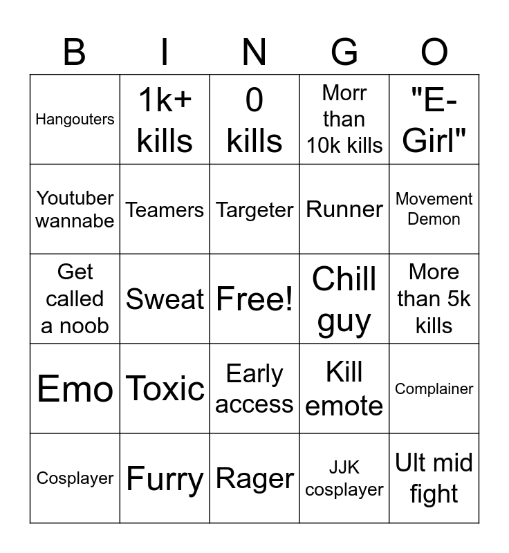 This bingo card has a free space and 24 words: Toxic, Furry, Targeter, Cosplayer, "E-Girl", Hangouters, Youtuber wannabe, 1k+ kills, Chill guy, Early access, Runner, Get called a noob, Kill emote, Complainer, Teamers, JJK cosplayer, More than 5k kills, 0 kills, Movement Demon, Sweat, Ult mid fight, Emo, Morr than 10k kills and Rager.