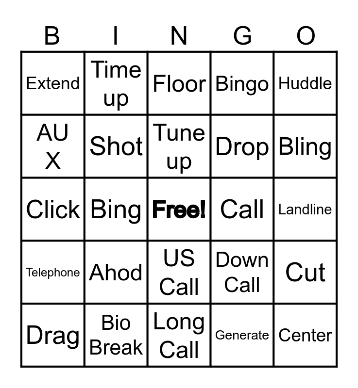 This bingo card has a free space and 24 words: Ahod, Bio Break, Tune up, Drag, Huddle, Extend, AU X, Time up, Call, US Call, Drop, Click, Down Call, Cut, Shot, Generate, Landline, Floor, Bling, Bing, Center, Telephone, Bingo and Long Call.