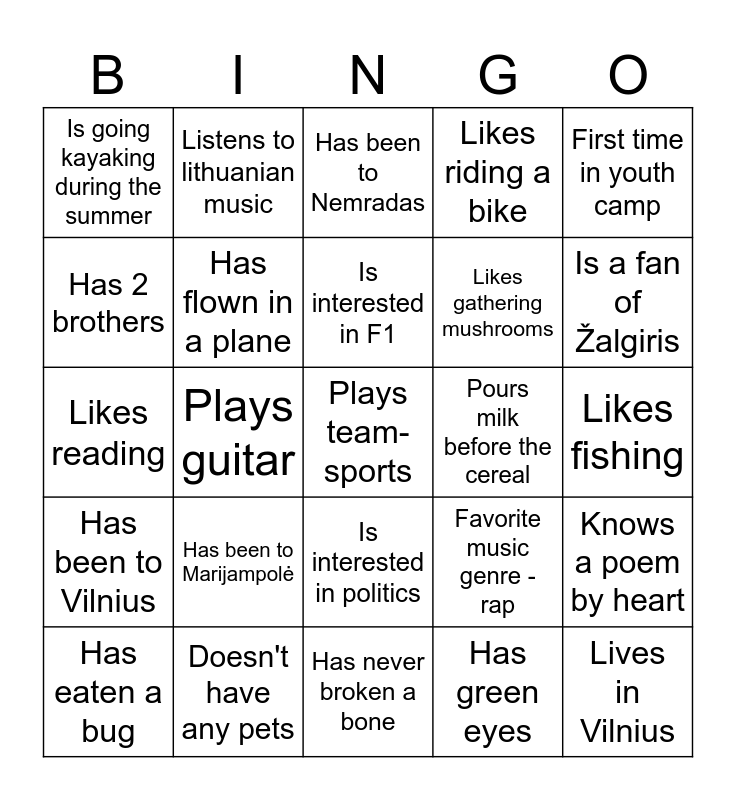 This bingo card has a free space and 24 words: Has been to Marijampolė, Doesn't have any pets, Is interested in F1, Has eaten a bug, First time in youth camp, Is going kayaking during the summer, Has 2 brothers, Listens to lithuanian music, Pours milk before the cereal, Is interested in politics, Likes gathering mushrooms, Likes reading, Favorite music genre - rap, Knows a poem by heart, Has flown in a plane, Has green eyes, Likes fishing, Has been to Nemradas, Is a fan of Žalgiris, Plays guitar, Lives in Vilnius, Has been to Vilnius, Likes riding a bike and Has never broken a bone.