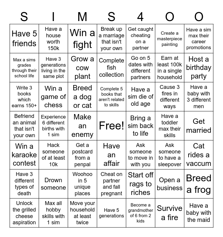This bingo card has a free space and 48 words: Start off rags to riches, Earn at least 100k in a single household, Have 5 generations, Experience 6 different births with 1 sim, Breed a dog or cat, Get married, Have a house worth 150k, Max all hobby skills with 1 sim, Create a masterpiece painting, Have an affair, Have a sim max their career promotions, Break up a marriage that isn't your own, Cause 3 fires in different ways, Have a sim die of old age, Have 3 different types of death, Have a toddler max their skills, Max a sims grades through their school life, Host a birthday party, Open a business, Get caught cheating on a partner, Go on 5 dates with different partners, Make an enemy, Have 5 friends, Have 3 generations living in the same plot, Breed a frog, Grow a cow plant, Have a baby with 3 different men, Unlock the grilled cheese aspiration, Complete 5 books that aren't related to skills, Win a game of chess, Survive a fire, Bring a sim back to life, Cat rides a vaccum, Drown someone, Befriend an animal that isn't your own, Ask someone to move in with you, Ask someone to have a sleepover, Write 3 books which earns 150+, Get a postcard from a penpal, Woohoo in 5 unique places, Win a karaoke contest, Have a baby with the maid, Win a fight, Move your household at least twice, Complete fish collection, Cheat on partner and fall pregnant, Hack someone of at least 10k and Become a grandmother of 6 from 2 kids.