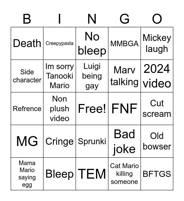 This bingo card has a free space and 24 words: Cringe, Bleep, Luigi being gay, Mama Mario saying egg, Mickey laugh, Death, Side character, Creepypasta, FNF, Sprunki, Marv talking, Refrence, Bad joke, Old bowser, Im sorry Tanooki Mario, Cat Mario killing someone, Cut scream, No bleep, 2024 video, Non plush video, BFTGS, MG, MMBGA and TEM.