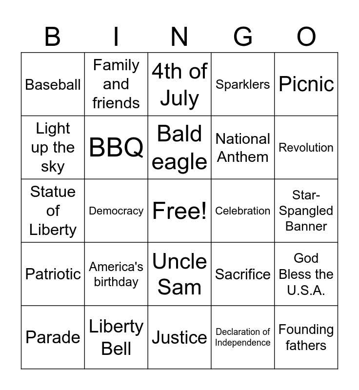 This bingo card has a free space and 34 words: Independence Day, Declaration of Independence, Fireworks, American flag, Patriotic, BBQ, Picnic, Parade, Family and friends, Memories, Bald eagle, 4th of July, Freedom, Red, white, and blue, Celebration, Revolution, Liberty Bell, Statue of Liberty, America's birthday, Sacrifice, Uncle Sam, Veterans, Baseball, Star-Spangled Banner, Justice, Founding fathers, Sparklers, Proud to be an American, National Anthem, Light up the sky, Perseverance, Democracy, God Bless the U.S.A. and Excitement.