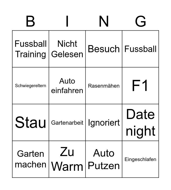 This bingo card has 20 words: Stau, Einkaufen, Besuch, Date night, Garten machen, Auto einfahren, Hat sich keiner gemeldet, Fussball, Schwiegereltern, Nicht Gelesen, Auto Putzen, F1, Fussball Training, Zu Warm, Ignoriert, Eingeschlafen, Gartenarbeit, Rasenmähen, Date night and Paket auf der Terasse.