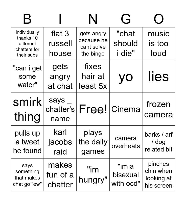 This bingo card has a free space and 24 words: karl jacobs raid, makes fun of a chatter, fixes hair at least 5x, says something that makes chat go "ew", music is too loud, individually thanks 10 different chatters for their subs, "can i get some water", flat 3 russell house, Cinema, plays the daily games, yo, smirk thing, camera overheats, barks / arf / dog related bit, gets angry at chat, "im a bisexual with ocd", frozen camera, gets angry because he cant solve the bingo, lies, says _ chatter's name, pinches chin when looking at his screen, pulls up a tweet he found, "chat should i die" and "im hungry".