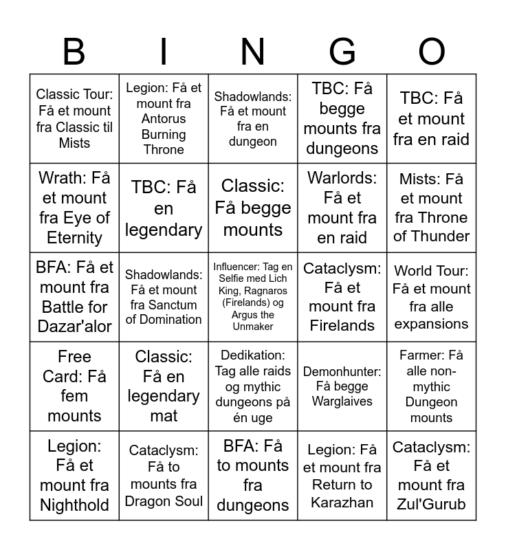 This bingo card has a free space and 24 words: Classic: Få en legendary mat, Cataclysm: Få to mounts fra Dragon Soul, Classic: Få begge mounts, Legion: Få et mount fra Nighthold, TBC: Få et mount fra en raid, Classic Tour: Få et mount fra Classic til Mists, Wrath: Få et mount fra Eye of Eternity, Legion: Få et mount fra Antorus Burning Throne, Cataclysm: Få et mount fra Firelands, Dedikation: Tag alle raids og mythic dungeons på én uge, Warlords: Få et mount fra en raid, BFA: Få et mount fra Battle for Dazar'alor, Demonhunter: Få begge Warglaives, Farmer: Få alle non-mythic Dungeon mounts, TBC: Få en legendary, Legion: Få et mount fra Return to Karazhan, World Tour: Få et mount fra alle expansions, Shadowlands: Få et mount fra en dungeon, Mists: Få et mount fra Throne of Thunder, Shadowlands: Få et mount fra Sanctum of Domination, Cataclysm: Få et mount fra Zul'Gurub, Free Card: Få fem mounts, TBC: Få begge mounts fra dungeons and BFA: Få to mounts fra dungeons.