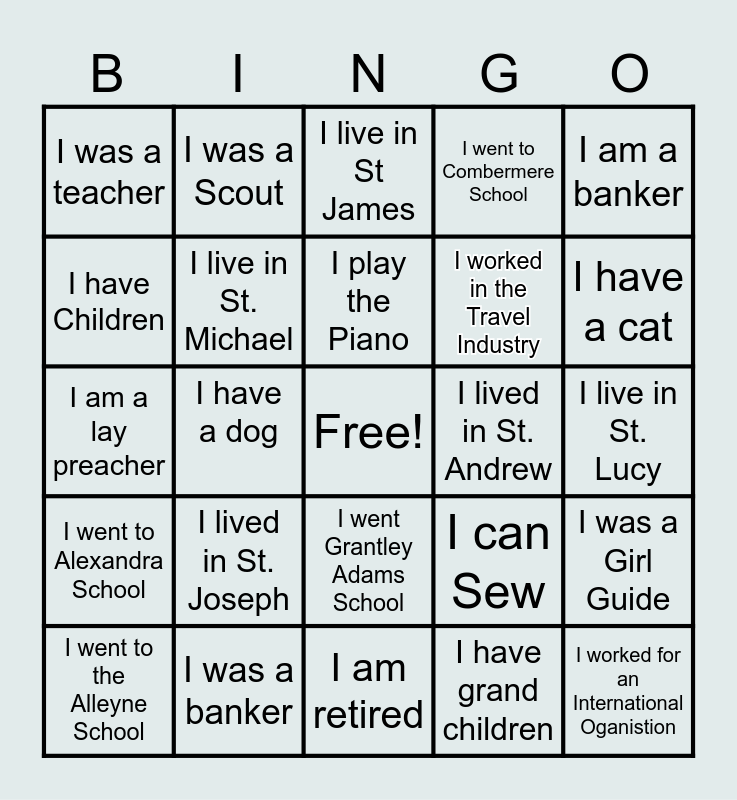 This bingo card has a free space and 29 words: I went to the Alleyne School, I went to the St. Michael School, I have a dog, In Kiwanis for more than 10 Years, I was a teacher, I live in St James, I live in St. Michael, I lived in St. Joseph, I lived in St. Andrew, I was a banker, I live in St. Lucy, I worked for an International Oganistion, I am retired, I have grand children, I have a cat, I live in St. Thomas, I went Grantley Adams School, I went to Alexandra School, I am a banker, I am a lay preacher, I can Sew, I sing in a Chior, I worked in the Travel Industry, I have Children, I went to Combermere School, I was a Scout, I was a Girl Guide, I play the Piano and I compete in Athletics.