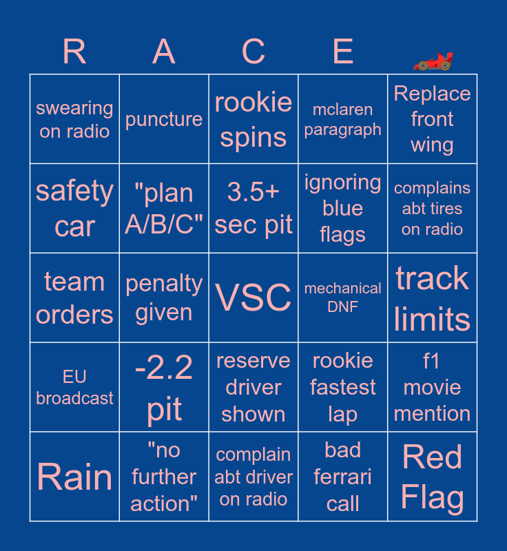 This bingo card has 25 words: -2.2 pit, complain abt driver on radio, 3.5+ sec pit, Rain, Replace front wing, swearing on radio, safety car, puncture, mechanical DNF, reserve driver shown, ignoring blue flags, team orders, rookie fastest lap, f1 movie mention, "plan A/B/C", Red Flag, track limits, rookie spins, complains abt tires on radio, penalty given, VSC, "no further action", EU broadcast, mclaren paragraph and bad ferrari call.