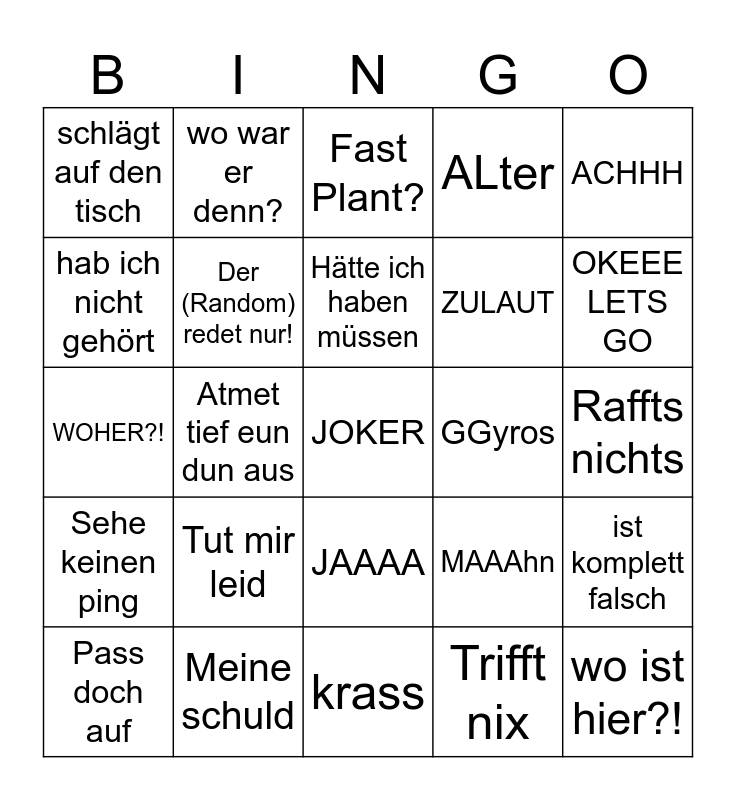 This bingo card has a free space and 24 words: Tut mir leid, Meine schuld, Hätte ich haben müssen, Pass doch auf, ACHHH, schlägt auf den tisch, hab ich nicht gehört, wo war er denn?, GGyros, JAAAA, ZULAUT, WOHER?!, MAAAhn, ist komplett falsch, Der (Random) redet nur!, Trifft nix, Raffts nichts, Fast Plant?, OKEEE LETS GO, Atmet tief eun dun aus, wo ist hier?!, Sehe keinen ping, ALter and krass.